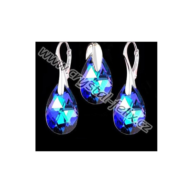 KVALITNÍ STŘÍBRNÝ SET JM zdobený krystaly PEAR hrušky BERMUDA BLUE, moodré kapky s odlesky, Ag925/1000